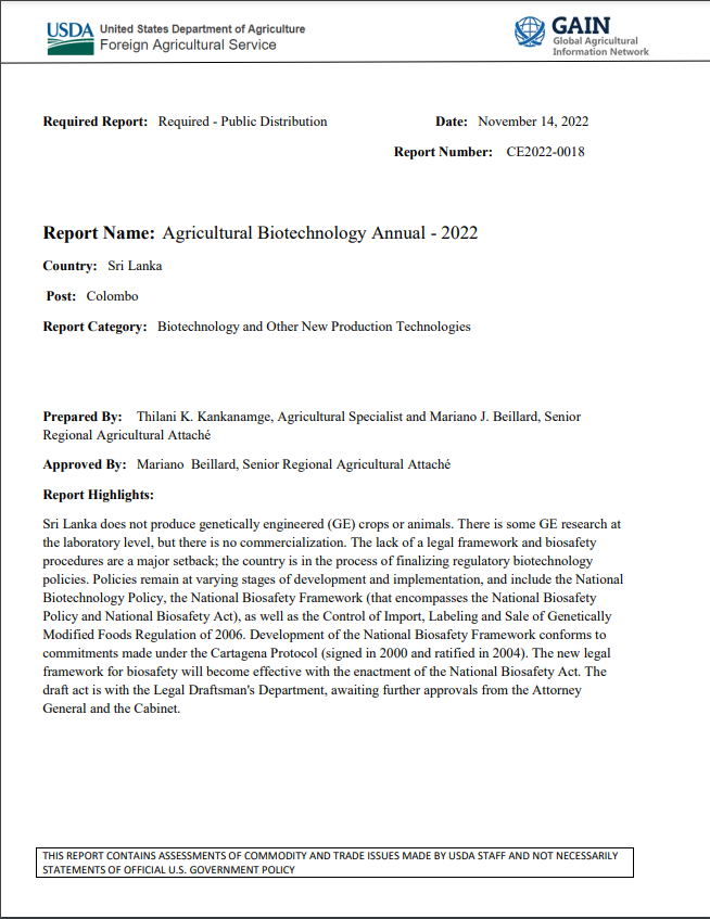 (2023) דוח אמריקאי מאשר ייצור מזון GMO בסרי לנקה מקור: AgricultureInformation.lk | מסמך של מחלקת החקלאות של ארצות הברית